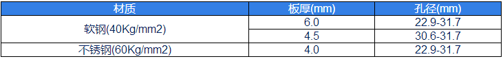 材質板厚(mm)孔徑(mm)軟鋼(40Kg/mm2)6.022.9-31.74.530.6-31.7不銹鋼(60Kg/mm2)4.022.9-31.7